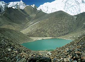 濁流をさかのぼると小さな峠になっており、前方には深緑色をした大きな池があった。ABCはこの池の少し上に位置している。ここは氷河上でなくて石の上のため、この先ズーっと雪の上でのキャンプ地という点を考えると、本当にゆっくりできそうな場所だ。