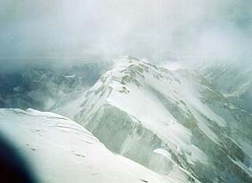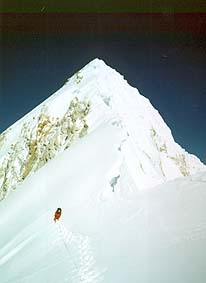 ルートは左手のアイスフォール帯を登り、南峰の左手の尾根上を登った