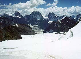 C2上部からC2(尾根上の黒い点)と、タムクタシュ氷河を見る