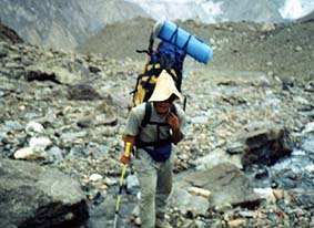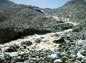 途中から右岸の氷河とサイドモレーンの境界あたりを歩き、そこで右岸に流れ込む濁流の川をさかのぼるように進む。第1次の遠征隊では、このカラクメ氷河を氷河の流れのままに上流へ進んだのだが、その過程でこのショートカットするルートが発見されて、これでずいぶん楽になった。