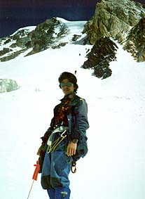 右はTC2上部の雪壁の下での私、雪壁を何人かが登っている