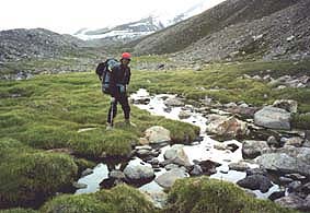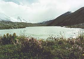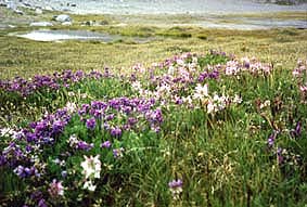崖を登りきった我々はその光景に唖然とした。「地上の楽園」いや「天上の楽園」と言ってもおかしくない光景であった。今までの不毛の氷河上から、花の咲き乱れる池が突如我々の目の前に現れたのだ。 |