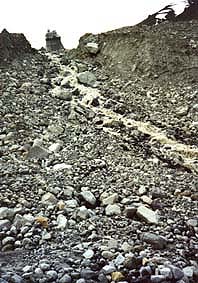 そうこうして氷塔の間を進んでいると、右手のサイドモレーンから濁った川が流れ落ちてくる場所に行き着いた。その上部はどうなっているかはっきりしない。逆に崖でないことは確かなので、さっそく川沿いに登り始めた。 |