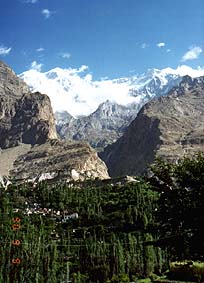 ![]() バルティットフォートの上からフンザの下流方面 左上にはラカポシ(7788m) |